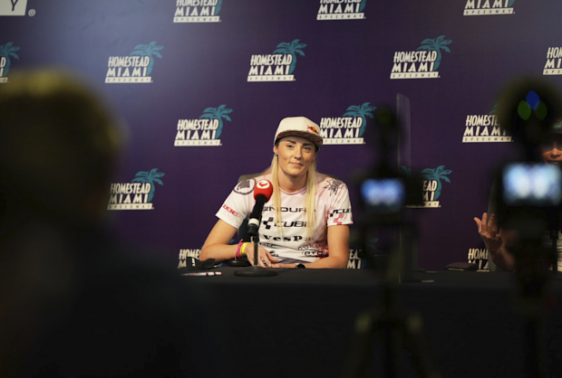 At the pre-race press conference, Lucy Charles-Barclay noted the challenges of the many turns on the infield bike course.