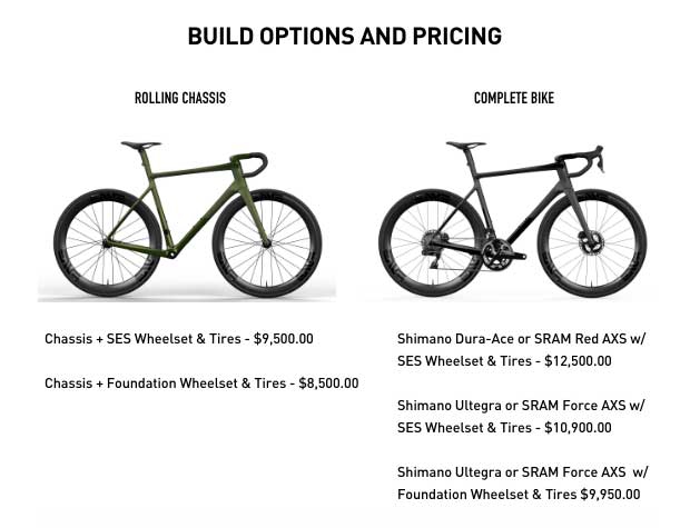 Above is the complete bike pricing. The “chassis,” i.e., the frame, fork, handlebars, seat post and the like, is $7,000. Unless you have a spare groupset hanging around, the complete bike is the much better value (as is the case with almost all bikes). Only if you’re a Campy-phile should you consider the frameset option. This bike, complete, with “SRAM Force AXS” (which is I assume eTap), seems quite a value when you place this against other custom-frame, bespoke-geometry, U.S.-made complete bikes.