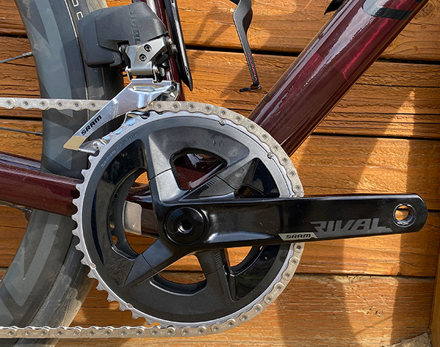 Rival eTap AXS has more metal, less carbon, it’s a metal (aluminum) crankset, and while there is a Quarq power meter option, it’s a one-sider (non-drive-side), and priced accordingly.