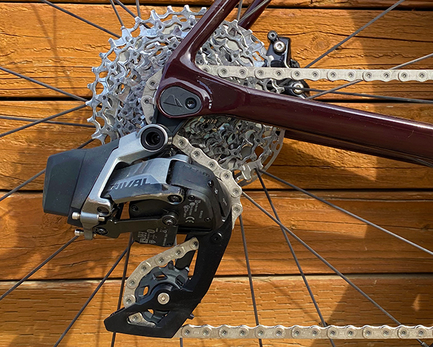 The RED and Force eTap AXS derailleurs have’s Orbit fluid damper system, and Rival eTap AXS uses a spring clutch to keep the chain from jumping off the chain ring.