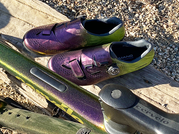 If you look at these images, you can see there’s a pair of shoes in a lot of them, and to be honest with you my very first impression when I took the Áspero-5 out of the box, was, Cervelo made a bike for the Shimano shoes! I’m not overly style-driven but I went bonkers for the Shimano RX8 gravel shoe in purple/green when I first saw it. That shoe and this bike were made for each other.