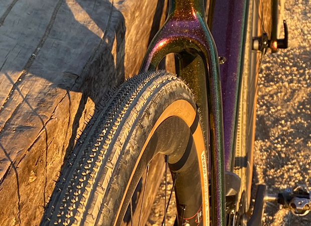 But to be fair, it’s got more clearance than most gravel bikes. Above is a close-up of the Áspero-5 with its standard issue Panaracer Gravelking in 38mm, on a 700c wheel, and as you can see that tire’s got a lot of room to “grow.” Below is the Áspero-5 with a set of HED Emporias in 650b, and those 50mm Schwalbe gumwalls, which was a hoot to ride around on.