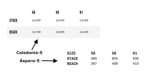 Let’s talk about geometry and fit for a moment. The Áspero-5 comes in 6 sizes, from 48cm to 61cm, and it is the most interesting fit geometry of any gravel bike I’ve seen. This bike is long. While I ride most bikes in size-58, I would ride this in a 56 because it’s so long. The best way is just to show the tallest 3 sizes side-by-side, with the geometry charts of both the Cal-5 and the Áspero-5: