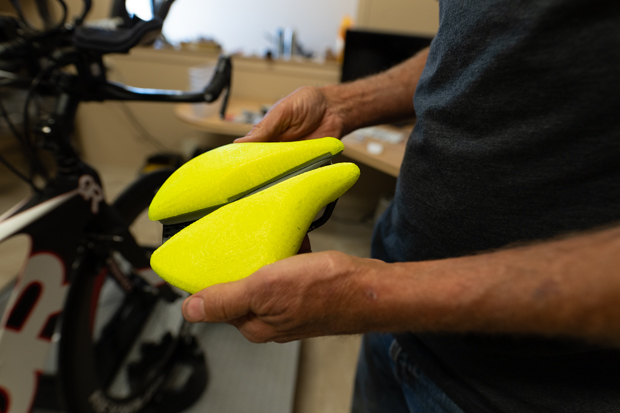Prototype foam molding is possible to do in BiSaddle's facility, and is done, but the quickest way to demo various shapes and foam contours is to 3D print “foam” right onto the saddle. Jon does this with relentless repetition, trying one saddle shape after another (Jon is a triathlete, and raced St. George last week).