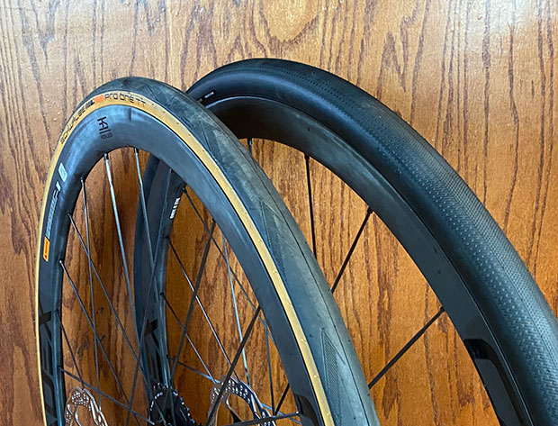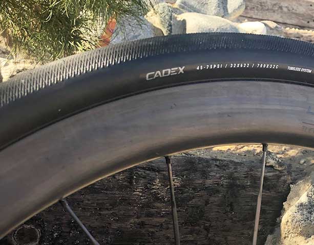 In the two pics above what you see are these CADEX 36 wheels with a Schwalbe Pro One TT in 25mm and a CADEX road tire in 32mm. Both systems are pretty seamless in the transition from tire to rim, and most of the (minor) leakdown with the Schwalbe is through the skinwall of the tire. The fitment, once the tire inflates and sits up on the rim shelf, is superb (if the tire is built to mate with wheels following current ETRTO spec). When you dismount these tires it feels like the tire bead is suctioned to the rim shelf. This is why CADEX tires and wheels suffer almost zero leakdown, even without sealant installed, which is pretty much unheard of.