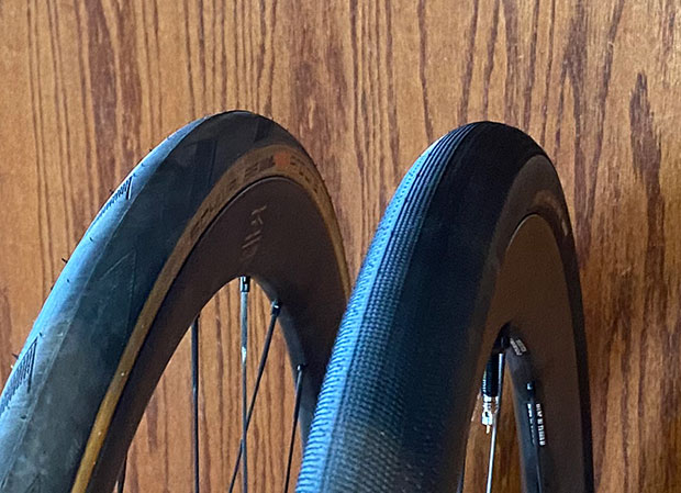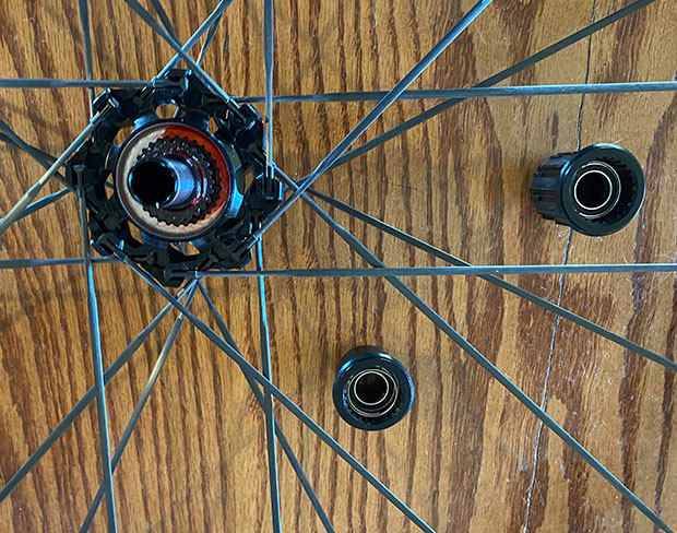 I mentioned that the Zipp I’ve been riding (the new 353) and this CADEX 36 have a lot in common, and I mean everything down to the color and transluscence of the tubeless tape. They’re both sent to the user with tape and valve installed; they both use 30mm to 36mm rim depth; both use hookless bead tech; both use an inner bead with of 22.5mm to 23.5mm; there are similarities in the hubs (in each case you just pull off the driver body and slap another on, as I’m doing in the pic above with this wheel).