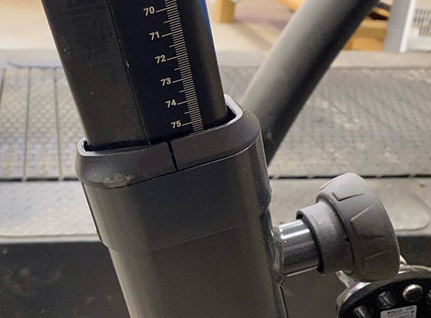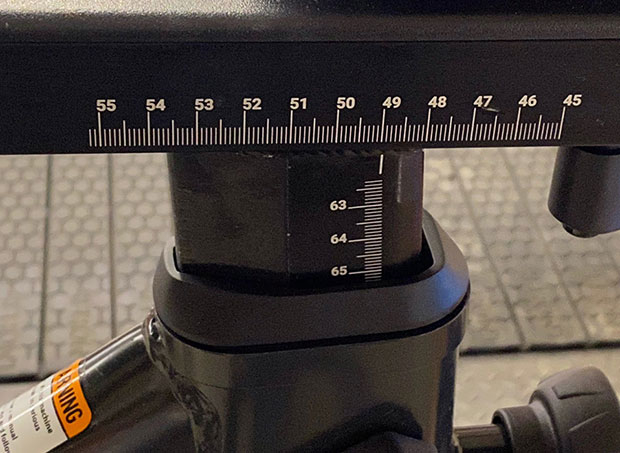 There are gradient etchings on the seat post, and on the horizontal and vertical slides in the front. The rear gradients are numbered, and seem to me to correlate to the distance from the BB center to the top of the saddle, midway between tip and tail, and that’s great because that’s a coordinate with which I’m very familiar.