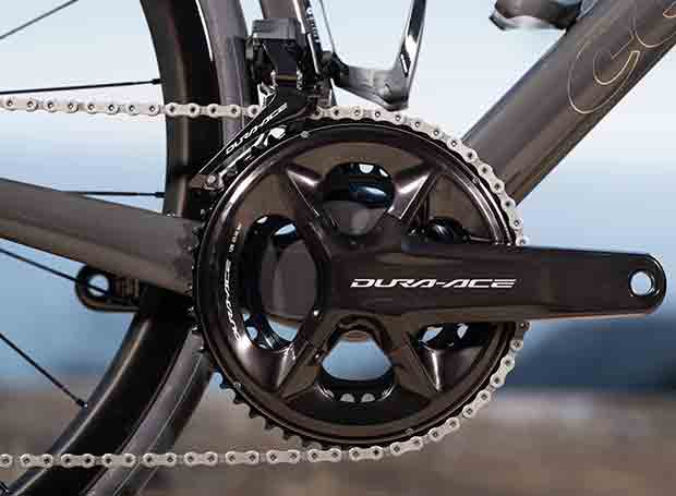 Dura Ace will offer crank lengths of 160mm, 165mm, 167.5mm, 170mm, 172.5mm, 175mm, and 177.5mm, and the Q Factor is 148mm. The Q Factor is the distance from the pedal shoulder, on the crank – where the pedal meets the crank – to the centerline of the frame, and then doubled. Almost all road bikes have a Q of 145mm to 150mm, except for some of the newer gravel options that add 5mm of Q, to accommodate fatter tires on certain frames, so this is a standard Q.