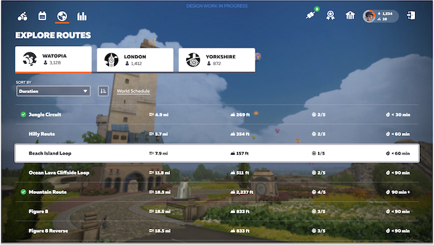 The user interface will be getting an update that promises to be more than cosmetic. The new interface combines workouts, races, and events in one place and makes it easier to sort and select them based on date/time, distance, elevation, and route. What’s new is that you will also be able to sort based on estimated duration (based on how long it would take 85% of Zwift users) and difficulty (labeled as effort in the pull-down menu). These new metrics will be of great help with deciding if you have enough time for a route and how difficult it will be (on a scale of 1 to 5).