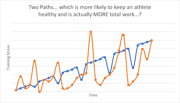 So where does this lead us? It leads us to what the most important training metric is. It’s not volume or intensity, but rather stress, which is generally considered to be a combined metric that considers both volume and intensity. Jesse Kropelnicki used to describe it as “how much oxygen you’re passing through your system.” We never directly measured that, but the concept of it is useful. TrainingPeaks has managed to assign a numerical value to stress with their TSS, ATL, and CTL metrics. I don’t use those a ton, but that’s just personal preference. I don’t have anything inherently against them, I just gauge the stress on my athletes’ systems in other ways (ability to hit workout targets, HR lag on intensity changes, overall mood, and motivation levels being the primary things I look at). One of the ways we control for this at QT2 is that we increase training stress by increasing volume or intensity in a given week, but not both simultaneously (of course there are exceptions to this rule, but in general that’s how we operate).