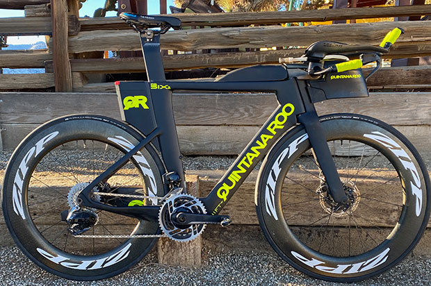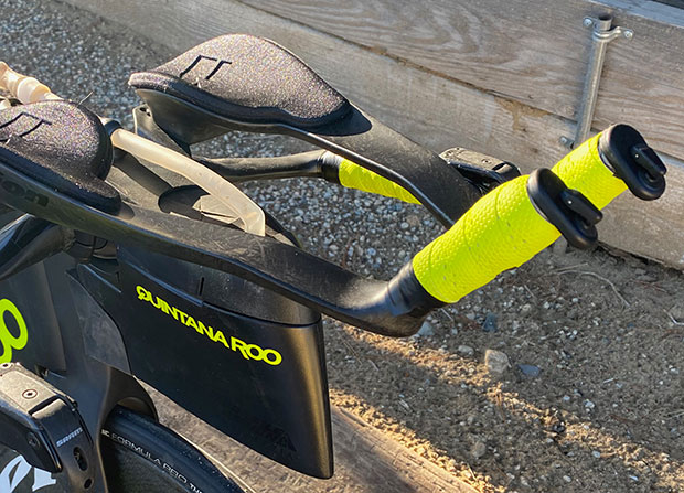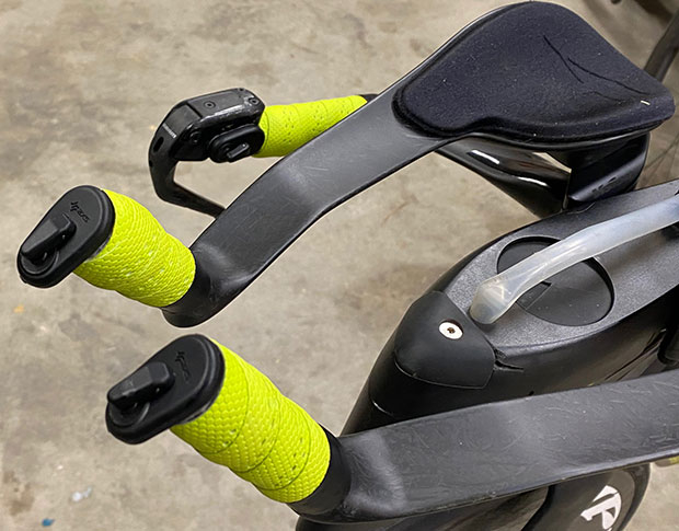 As to the bar-end placement, I took the round end plugs that went into the Vision Metron TFE Pro Extensions (which I placed on the Quintana Roo PRsix pictured here), and I cut them flat (I put the plugs into the bar ends, put the bar ends into a miter box, and decapitated the round head with a Sawzall). I did this so I would have a flat surface on which to mount the Blip with the 2-sided tape.