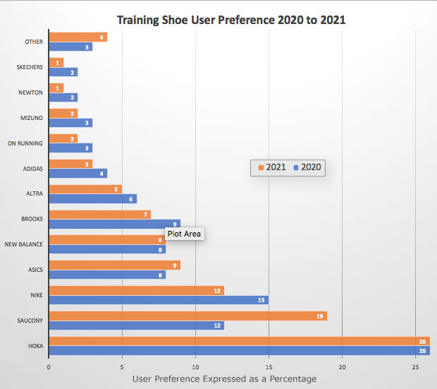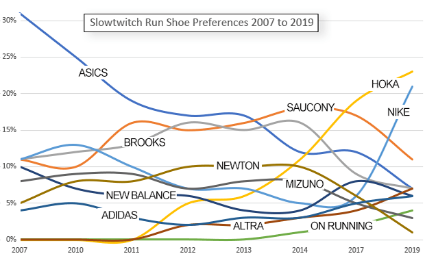 Among our readers Skechers, Mizuno, Newton, ON Running, Adidas, Altra, Brooks all lost barely a tick over the past year. New Balance remained in place and ASICS gained a tick, which doesn’t surprise me because the MetaRide collection looks really intriguing to me (I think ASICS may be onto something).