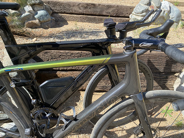 Above are two bikes in the workshop right now. One is a Trek Speed Concept, which is of course a tri bike. The other is a Cervelo R5. One of the most advanced features in that Speed Concept is top tube storage inside, rather than on top of, the top tube. Part of why that’s possible is – as you can see – the top tube is deeper on that Speed Concept. But not much wider. Max width of that top tube on the Speed Concept is 54mm, and on the R5 it’s 48mm. Yes, you can get away with a wider top tube on the Speed Concept because tri bike top tubes sit lower, by about 4cm to 5cm on average, than they do on road bikes. But I’ve never come that close to hitting the top tube with my knees on that R5.