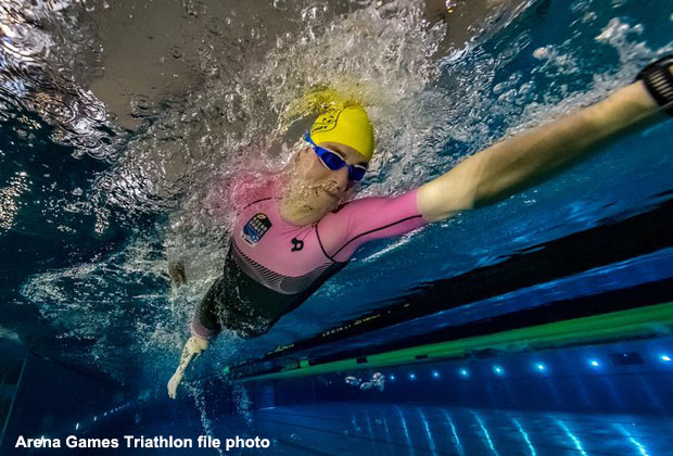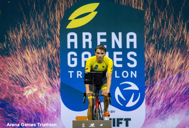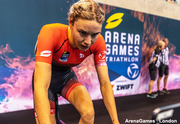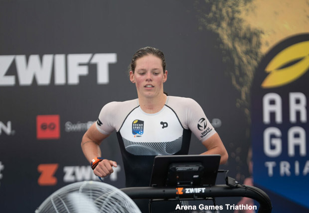 In the women’s third and final contest in the 2022 Arena Games Triathlon series, Zsannett Bragmayer of Hungary surprised the field to take a 4 seconds margin of victory over super runner Beth Potter of Great Britain. Potter, who won the first Arena Games event in Munich and took 2nd in the final event in Singapore, took the overall title in the first eSports World Triathlon Championship series by a 713 to 645 points margin over Bragmayer. Olympic silver medalist Georgia-Taylor-Brown of Great Britain took third on the final day – 36 seconds behind Bragmayer – and finished third in the series, 19 points behind Bragmayer.