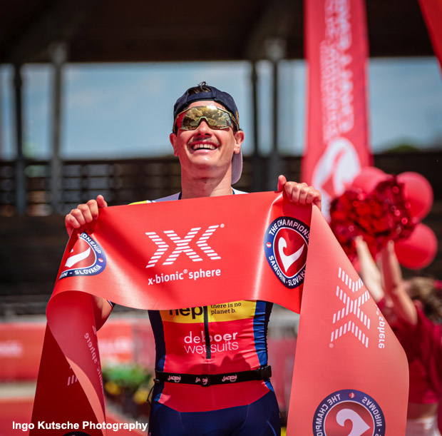 Overcoming a flat tire and a 2:28 deficit after the swim, Gustav Iden of Norway blasted the bike and run splits to fend off home-country favorite Richard Varga of Slovakia and finish in 3:43:44 with a 1:21 margin on Varga and 2:49 on Thomas Steger of Austria at Challenge the Championship. Iden thus wiped away his disappointing non-start at the Ironman World Championship at St. George two weeks ago.