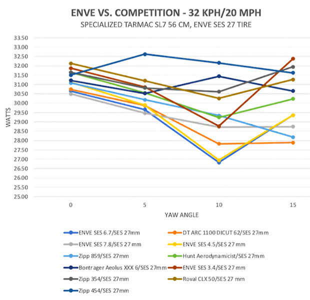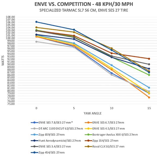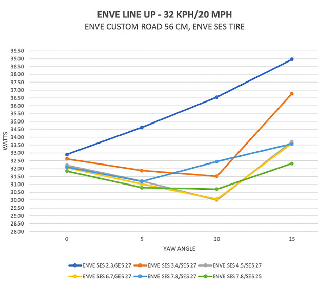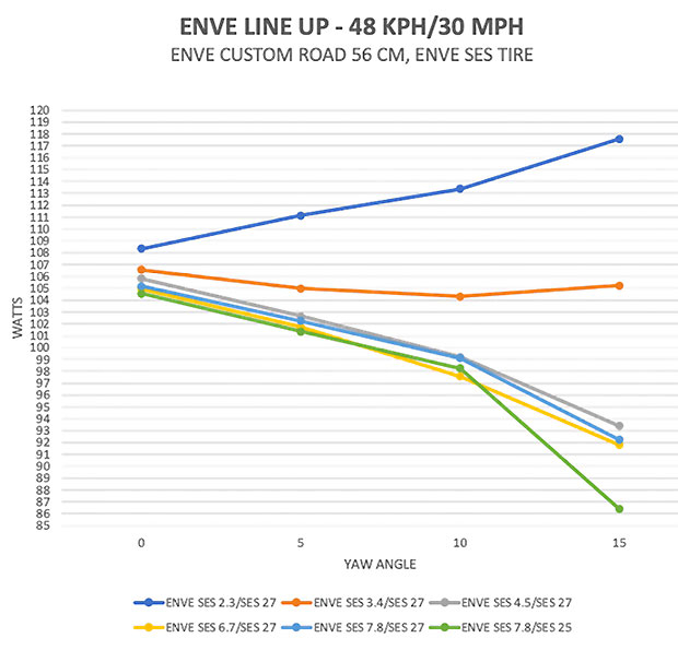 The 6.7 matches or is very close to ENVE’s 7.8 in almost all speeds and yaws in the wind tunnel testing ENVE provided for this wheel launch, which means 6.7 should be the easier of the two wheelsets to handle in windy conditions and without much if any aero penalty. For example, the one area where the 7.8 with a 25mm tire obviously beats the 6.7 with a 27mm tire (when mounted on one particular bike) is in a 15° yaw, but when that sidewind hits you what do you want, a slight bit more speed, or the confidence to remain in the aero position? The 6.7 wheelset comes in at just under 1500 grams for the pair, which is light for a wheelset with rims this deep.