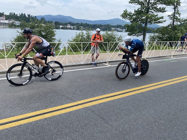 Justin Metzler passes age-group athlete Jack Vennetone as Metzler completes the 110 mile bike. This year's course was slightly shorter than normal due to construction.