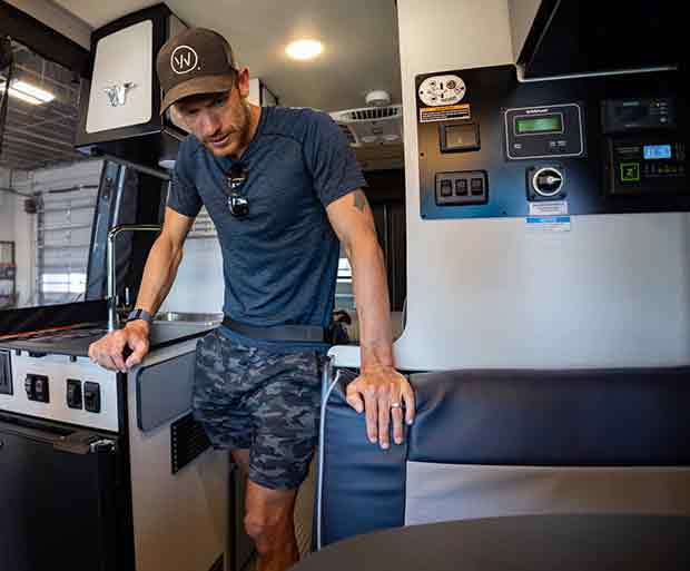Outfitted, the Revel is about a $200,000 home on wheels. Here’s the Revel in which you’ll find Lionel and Erin, as they travel from race to race, and from Eastern Canada to Tucson to Flagstaff and wherever they’ll stay to train.