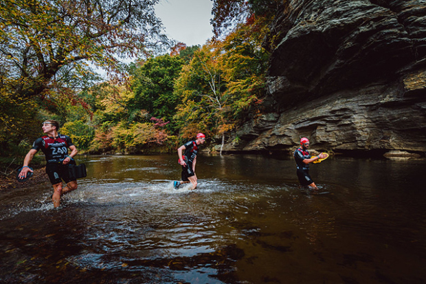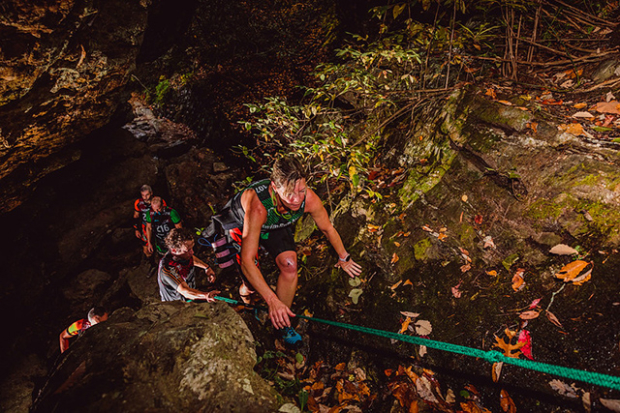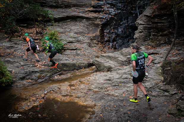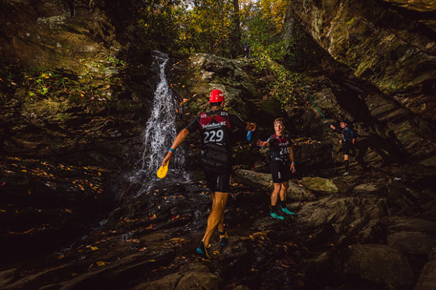 Teams going through the upper section of the Cascade Falls section of the course. David Stackhouse here with team mate Lauren Shoup about to pass Lindsay Dean and Cameron Simmons in the mixed division.