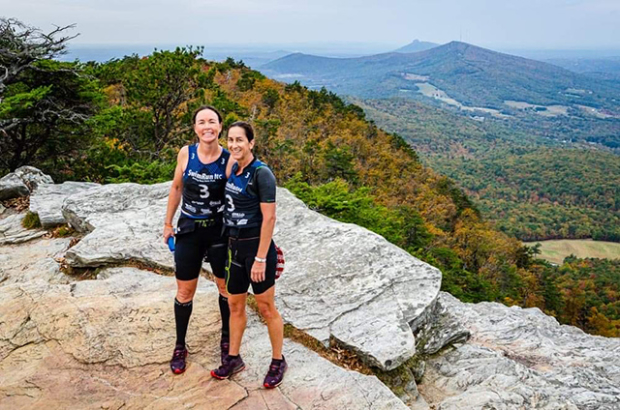 Sara McLarty and Misty Becerra on top of Moore's Wall with a little cushion over the second and third placed teams. All teams are required to pose for a pic at the courses highest spot as proof that indeed they made it here.