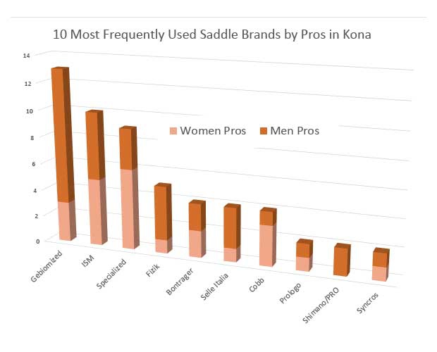 But the saddle that really surprised me was the 10th-most used saddle by the AGers, made by Gebiomized. I counted every piece of equipment used by every pro in both Thursday and Saturday races and it was a shock to see this saddle on so many bikes. In fact, I probably undercounted this saddle. As you see from the chart below this was the most-used saddle by pros in Kona.