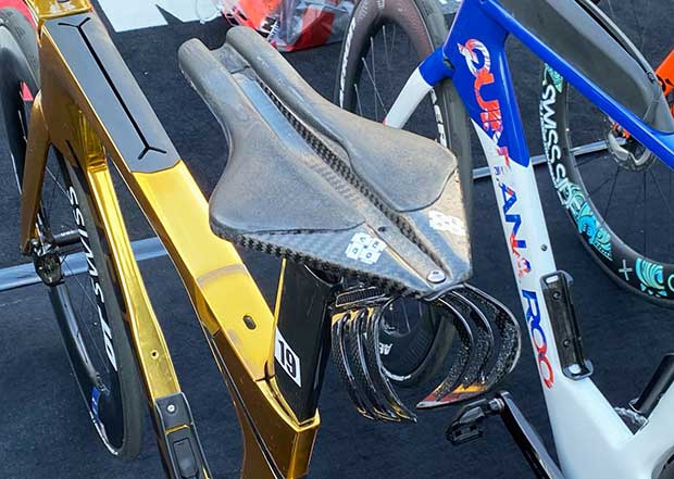 This saddle showed up mostly under the derrieres of European pro athletes and I highly suspect that the 100 Gebiomized saddles in the AG race also came over from Europe. (Gebiomized is a German brand.) To remind you what Gebiomized is all about, there’s a powerful narrative here. This company is best known for its pressure mapping system used by a lot of bike fitters. You place their pressure maps on saddles, aerobar armrests, inside cycling shoes, and you can see on a computer screen color coded images that show where your pressure is applied. You then cure these hot spots using whatever strategies you as a fitter might employ and – the theory goes – the customer is now more comfortable.