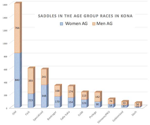 To read that chart accurately first understand the following inaccuracy: When I list Women AGers I’m really listing Thursday racers, which included men. But that day belonged predominantly to women, so I listed it the way I did. ISM was the big winner – again – because it probably remains the predominant aftermarket purchase by those looking for the most comfortable saddle when riding in the tri position.