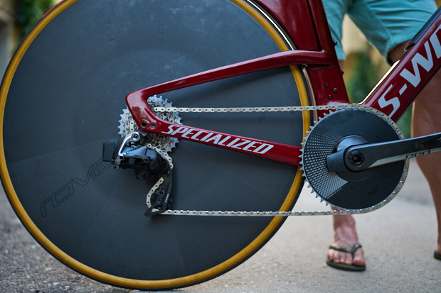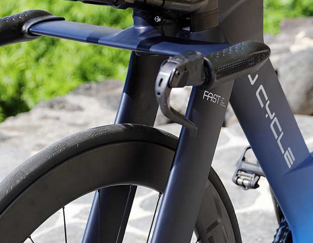Because I felt I was selling out a little on the design, I contracted with wheel companies to make me wheels with a flange width of 60mm, rather than the typical 80mm. If I couldn’t get the fork blades all the way away from the wheel, I’d compensate by getting the wheel farther away from the fork blades. One thing you’ll note about Blummenfelt’s bike is the front wheel. See how far that 4-spoke is away from the fork, because of its narrow aspect. Anyway, that’s why I call this a triplane front end.