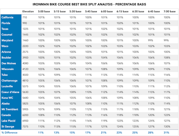 Finally, the second table translates each bike split to a percentage of the “base” bike split, again organized by column for each “base” bike split and sorted by bike course elevation gain.