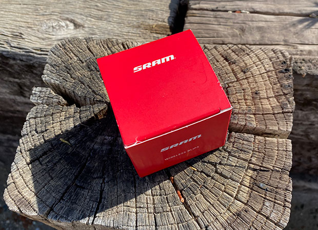 Here above is how I mounted these Wireless Blips previously. Functional but not ideal. In fact, SRAM has made a great product with a bad (for tri) mounting system and I’ll show you how that got fixed for this KÚ I’m riding. Let’s recap on the Wireless Blips. Below is the box they come in.