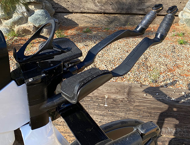 Built into the KÚ are collets that host standard round extensions and that’s the other kind of full forearm extensions: Those that terminate in a round tube. Enter the Profile Design 43asc about which I’ve written quite a bit. I love the Zipp extensions because I love the shifters in them, but the aerobar world has moved on. Just, I lose my bar end shifters by changing the extensions. This is where the SRAM Wireless Blips come in.