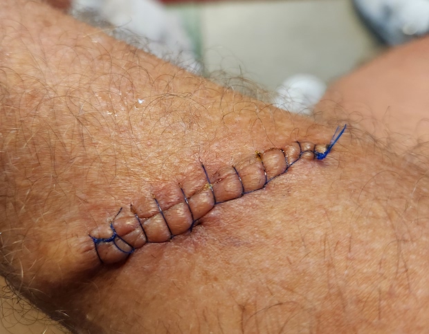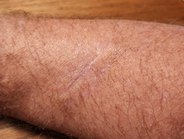 The excision surgery is gnarly. The spots were the size of dimes, so that meant that my dermatologist had to cut out a spot the size of a quarter to make sure she removed all the basal cells. And, she also had to cut a thru line across the spot, so that she could have a seam to stretch the skin and sew the whole thing closed. The procedure is as medieval as it sounds, and you are awake for the whole thing. I made sure to look the other direction while my dermatologist was hacking away and sewing me shut. The result is a surprisingly large sewn up incision for the size of skin cancer spot. However, the scarring is just as surprising in that it’s pretty minor compared to what it seemed it would be, blending in with the other scars on my arms from years of bike racing.