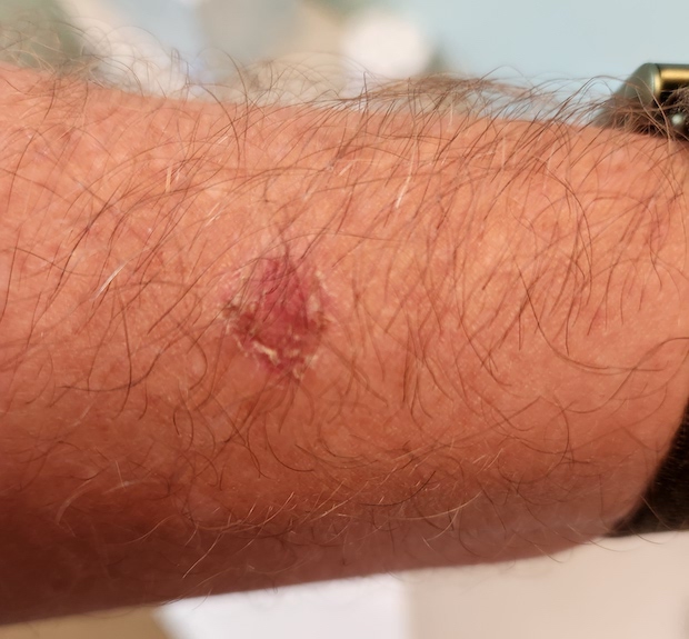 Last year, I noticed these small patches of dry, flakey skin about the size of a dime, one on each of my forearms. I didn’t think much of them and occasionally applied whatever moisturizing lotion was in the bathroom closet. However, they wouldn’t go away, and occasionally they would crack and bleed. I figured they would heal on their own eventually.