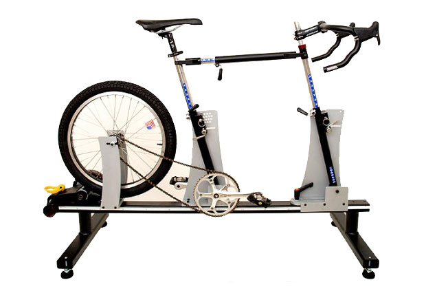 The first fit bikes were offered by custom bike makers and I call these “angular” fit bikes as opposed to what I call “X/Y fit bikes.” Angular bikes like the Waterford Fitmaster above resemble regular bikes. This was the start of anything that approximated dynamic bike fit. You used a static system to establish fit coordinates and then you set up a fit bike like this according to those coordinates. Voila, that fit bike matched the geometry of the custom bike the fitter would have his custom bike vendor build for you. Seat and head angles, top and head tube lengths, were all just read off the fit bike. Examples of angular fit bikes like these were made by Serotta and Calfee and as you’ll note every company I’ve mentioned made not only fit bikes, but custom bikes.