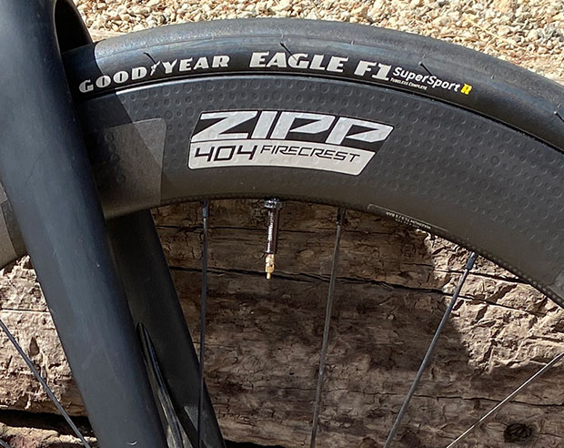 I find that Goodyear tires (this one and the sturdy Eagle F1 R) are a good match on several tubeless wheelsets, but a great match on all my Zipp tubeless wheels with hookless beads. In the same way that CADEX tires mate extremely well with CADEX wheels – precise fitment the key – that’s what seems to be going on with Goodyear and Zipp. By fitment I mean: they hold a seal even before you put sealant in the wheels; there is no bubbling between rim and tire where sealant, once installed, tries to escape; the tire mounts and dismounts with no fuss. The Goodyear tire exhibits the no-leakdown behavior you find in a vulcanized tubeless tire with perfect fitment. I have a set of Zipp 808 Firecrest wheels that haven’t been pumped up for months yet that Goodyear F1 R tires mounted on them still hold a good deal of pressure. The same is true when I mount Goodyear tires on Zipp 404 Firecrests.