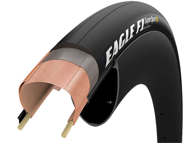 The tire you’ll be most interested in is the race-oriented Eagle F1 Supersport R. I ride this tire in its 28mm version because I’m done riding anything smaller than that size for any cycling specialty, for any use. But I only have data on this tire in its 25mm size, and I have that same data (as you do) for the Continental Grand Prix 5000 S TR 25, which has been the state of the industry for the past year for fast-rolling, roadworthy road race tires. These two tires are within the margin of error of rolling equally fast on the Bicycle Rolling Resistance drum tester, 9.1 versus 9.4 watts (both at 100psi).
