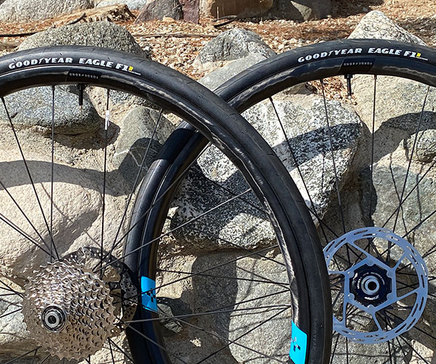 As to recent entries on the chart, of course there are recently launched Vittoria tires – the Corsa Pro and the Corsa Pro Control – and there’s a third that one might assume is coming and you folks would (theoretically) love this one for your WC triathlon ambitions, but this tire might exist and it might not. I can only say that there was a pretty interesting tire underneath Jonas Vingegaard when he demolished the field in the TdF time trial. Beyond these tires, added were a pair of tires from Goodyear, I wrote about the racy one last week, and I’m riding the F1 R (the highly durable version) on a set of Forge + Bond Allroad wheels pictured in the image furthest below. You haven’t seen these wheels on our chart yet. When I’m satisfied they’re ready for the chart up they’ll go and, to be clear, these are Allroad wheels for a road chart but I have grown quite fond of this use case (e.g., the CADEX AR). Speaking of CADEX, I just added the aero wheels you see Blummenfelt riding.