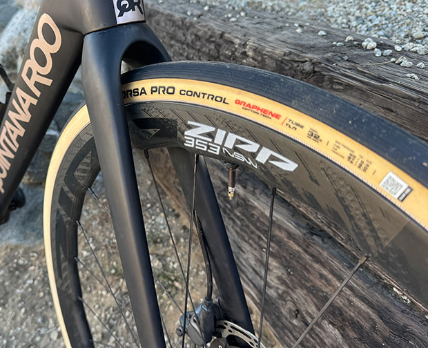 Again, as with my gravel bike the very first consideration was capacity for tire clearance. The SR6 allows for something like 35mm tires and while I won’t go that wide the bike as you see here is shown with 32mm tires. You might wonder why so much tire clearance for an aero road bike and to that I have a couple of answers. First, a lot of aero bikes these days use very wide blades and stays, and for aero reasons (see BMC’s new road and tri bikes, and they are not the only ones). So, you by happy design get clearance with aero. Secondly, I have long had a habit of having 2 wheelsets for 1 road bike. One wheelset is “performance” (when I just have to reclaim that STRAVA segment!). The other is for my typical very knockabout riding. I do a lot of road rides in places and on surfaces where it would be easy to get a flat, or dent a rim, and/or get stranded. I have a set of 32mm tires on “allroad” wheels as my everyday road bike wheelset. I guess it’s hard to imagine a Zipp 353 NSW as an allroad wheel but it serves the purpose for this bike. These are Vittoria Corsa Pro Controls and for this tire in 32mm I would have to specifically seek out glass and thorns to have any hope of getting a flat. More on wheelsets in a future installment.