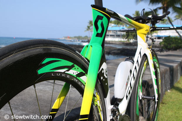 The custom Zipp graphics on his Firecrest 808 wheels match the paint job nicely.