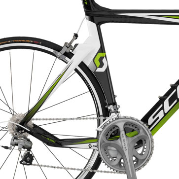 One final mention: these Scott frames have a feature I've rarely seen elsewhere, a chain stay shaped so to cause the rear derailleur to be "faired" by the chain stay, just like the rear wheel is faired by the seat tube. Does it work? I don't know. Does it make for a sexy narrative? You bet.
