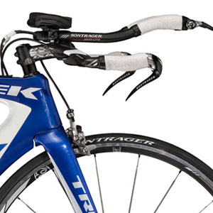 The Bontrager bar spec'd on this bike is of a taller style than the Bontrager that'll go on the higher end Speed Concepts. Still, I wouldn't demand a change to a lower-profile aerobar until I got myself fitted, and saw whether this bar was a good match for me. First things first: Get rid of all but 25mm or less (15mm is close to ideal) of total distance (headset top cap plus spacers) between the head tube top and the bottom of the stem, and, get yourself a flat (-17°) stem on your prospective bike. Make that stem be 100mm if you're riding a 58cm or 60cm bike) or 70mm (if you're riding a 52cm bike or smaller) or something in between in the other sizes. Then decide whether that Bontrager aerobar geometrically works for you.