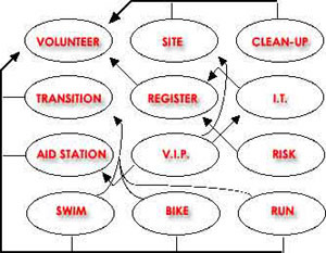 Adjacent you see an organizational chart, and the arrows represent those entities that are needed by other entities. For example, you'll see that almost everyone needs what the Volunteer Coordinator controls. Also, the Transition Coordinator is needed by the Swim, Bike and Run Coordinators, because he has to take their athletes from one event and in a streamlined fashion get them to their next event. The V.I.P. Coordinator needs the I.T. Coordinator to get results to the media and sponsors as quickly as possible in whatever format is appropriate (wouldn't it be nice to hand every sponsor, city father, and media a thumb drive just after the race with results and photos?).