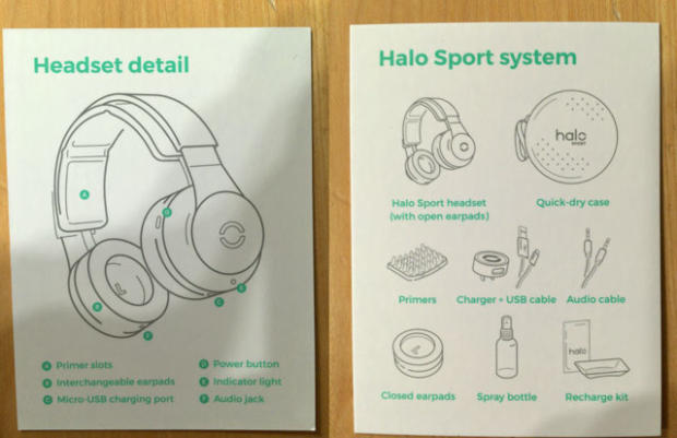 The Halo Sport includes an adjustable headset with a set of 3 primers, a recharge kit that includes two packages of solution and a cleaning tray, spray bottle, 2 sets of ear pads (open and closed), an audio and USB charging cable, and a carry case. The carry case is the perfect size to carry all the essential components to a workout as shown in the pic.