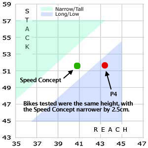 The P3 and the P4 don't always, or even typically, "win" wind tunnel tests (the P4 did however "win" this one, as you'll read) and I have a theory as to one reason why this happens. Note that for this test the Speed Concept chosen was of a size that granted each bike equal "stack," that is to say, the bikes for purposes of positioning were of equal height. Because the Cervelo is a longer bike than the Speed Concept—when normalized for stack, as these bikes were—the Speed Concept would have to have a longer stem placed on the bike to normalize each bike for the DZ position.