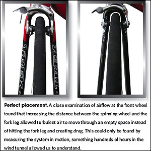 Ralph Ray (bike biz old timers will remember him) was at A&M as well, and explained it to me this way: "Wynn is trying to get rid of interference drag." Specifically, the problem Wynn was solving is similar to the interference drag created by closely spaced parallel surfaces such as the wings of a biplane. Elegant idea, thought I, especially because Cobb and Hed each had an eyebrow raised when looking at the drag on any bike with Wynn's fork attached.