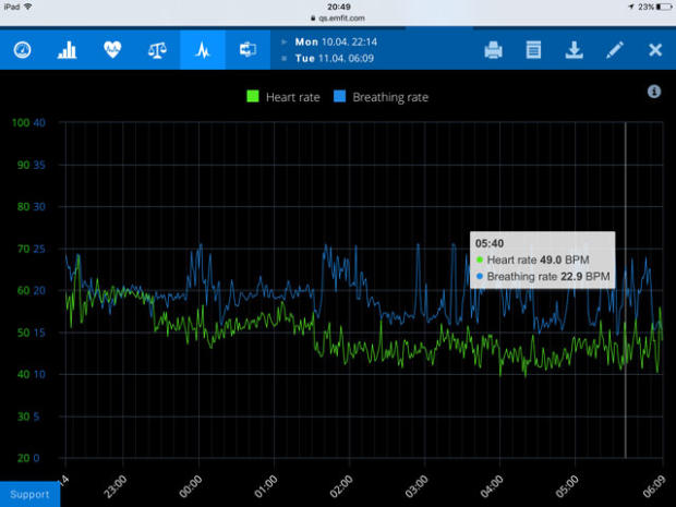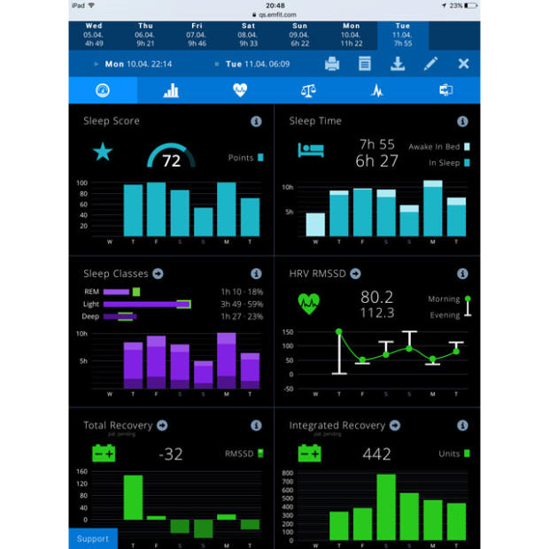 The EMFIT QS measures full night HRV, heart rate and breathing rate, movement during sleep, along with some derivative metrics such as phases of sleep, autonomic nervous system balance, sleep score, and HRV recovery. The EMFIT operating system lets users analyze the various metrics via their web interface in several data increments including: 7, 14, 30, 60, and 90 days, or custom ranges.