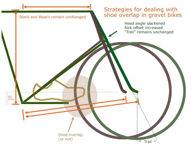 A much bigger issue is shoe overlap. As you see in the image above – which is not to scale and somewhat exaggerated for effect – a bike that may have no shoe overlap with 30mm tires may have it with 40mm tires. So, the gravel bike you get either will or won’t have shoe overlap depending on what tire radius the designer had in mind. Fun fact: as the image above shows, you can push the front wheel further in front of you without changing the trail by both slackening the head angle and increasing fork offset. For very different reasons this technique is used in gravel bikes (for shoe overlap), tri bikes (for weight displacement) and women's bikes (for bike fit reasons).