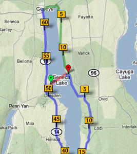 These unrelated fragments conspired to encourage the development of the Seneca Epic (map above), an event that's on my to-do list but has yet to happen due to difficulties finding a date and obtaining a permit from the state DOT. The race capitalizes on the convenient fact that Seneca Lake is 73 miles in circumference, with the city of Geneva at once 60 miles (around the southern tip of the lake) and 13 miles (around the northern tip) from Sampson State Park. This is convenient because those are ideal distances for a bike and a run. The swim across Seneca Lake (remember, we're using the local topography) is not as convenient at 2.8 miles, but that gave me reason to make the Seneca Epic a team event, with two teammates allowed to trade off during the swim (and work together on the bike and run).