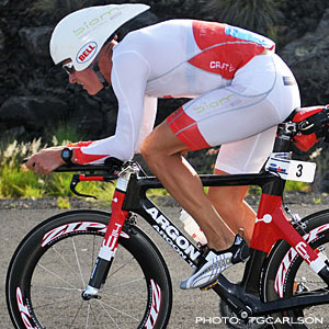 Accordingly, I was set to position this rider's bike at 79 degrees. But, I obeyed a hunch and chose a position slightly rearward of this — about 78 degrees. Why? Because, while I've never met this rider, I've seen him time trial, and he typically rides in a rearward position. I was confident he'd move forward on the bike once optimized for this forward position, but it's been my experience that a lot of bike racers are outliers, in that they'll move forward in incremental steps. Only about half move as far forward as do pro triathletes when they're first afforded the ability to do so. Mind, I'm still setting him up steep, just 2cm or 2.5cm rearward of the place I'd typically expect a top pro triathlete to sit. (The position I chose for this rider was similar to that ridden by Torbjorn Sindballe, pictured adjacent at the 2008 Hawaiian Ironman.)