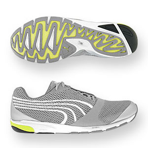 You may not run as fast as Usain Bolt, who is a Puma Runner, but the Complete Road Racer III (pictured just above in grey) is a very fast shoe made specifically for the midfoot/forefoot runner. Weighing in at 8.4 ounces, it feels like there is something more substantial on your feet. Not that this shoe is heavy, but that it gives you more protection than a lighter shoe. The idcell cushioning system that Puma uses is in the heel and forefoot and you can really feel it. This is a great fitting shoe as the upper is snug but not too snug…nice feeling upper from the inside as well with not too many places that could cause hot spots. The torsional rigidity does give this shoe some stability but is still considered a “Neutral” shoe. Puma has taken some strides with tweaking some of their running shoe lasts over this past year. Very comfortable shoe.